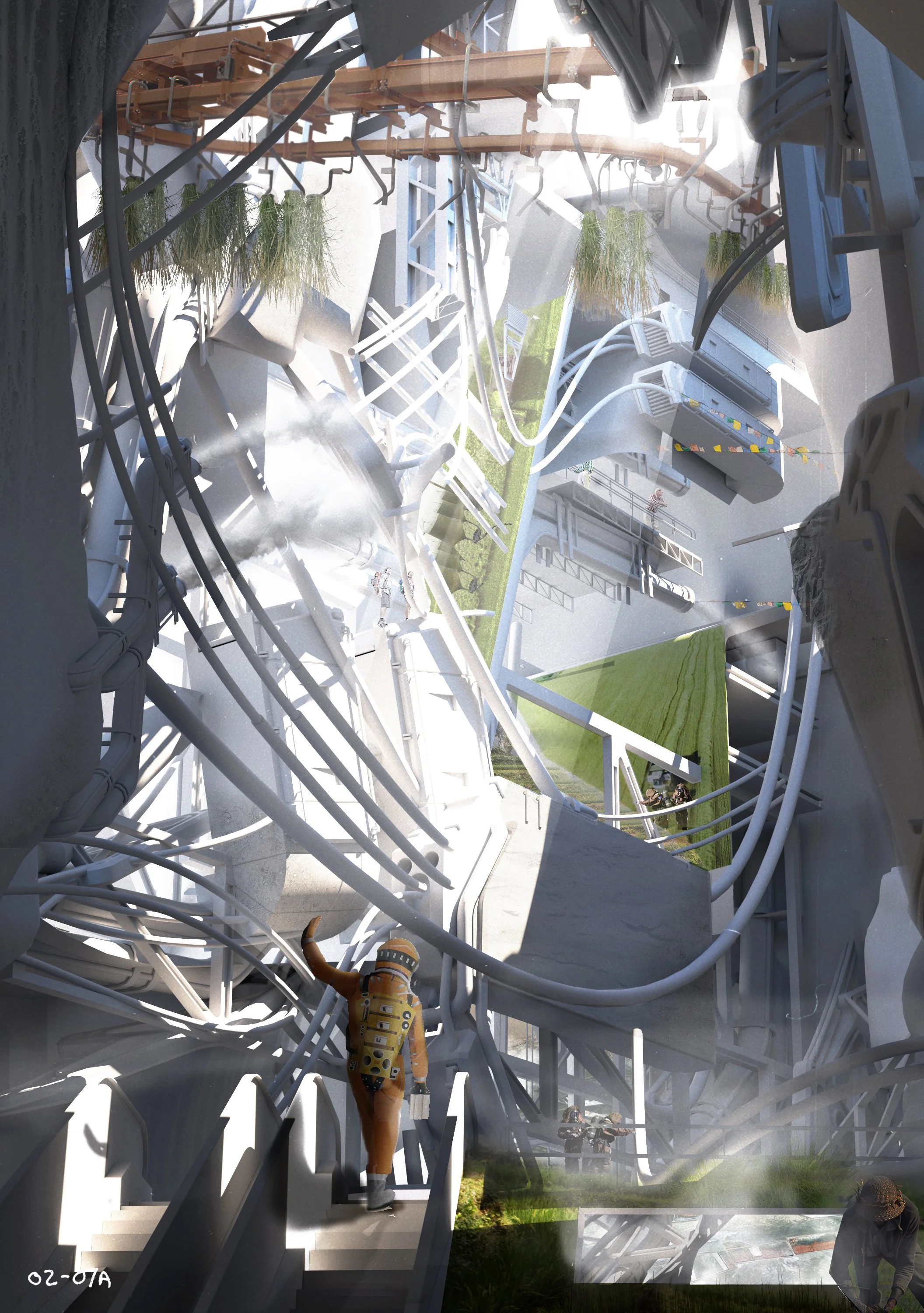 Cloud seeding is our industry. We exist within the life cycle of these animalistic machines. Sheltered within the bays of these towers, mechanized farming provides the raw material of our meat and potato thoughts. Water captured in bladders that hang loosely off the tower provides for the farms and the seductions of unnatural sanctuaries that pocket the tower for migrating birds and rodents that hitch a ride. Tubes of digestive tracks run throughout the beast collecting wastewater, sending it to be cleaned and recycled in the tower’s base. This closed system of vertical farming/living machine provides food for the community of farmers and workers housed within the structure. These activities within the towering structural beasts allow us to live in this toxic environment, occupying spaces of chaotic, multifaceted, organic infrastructure.